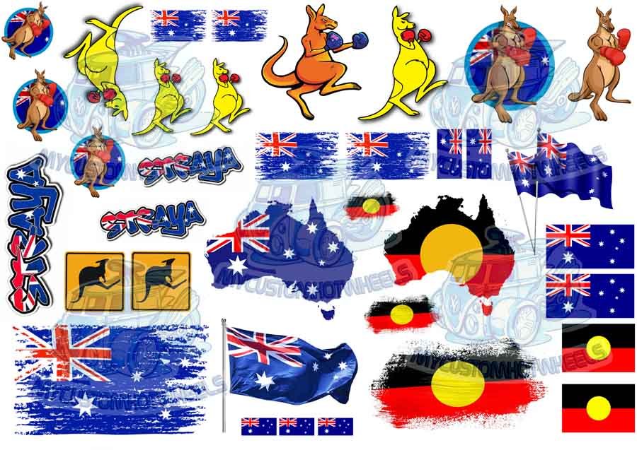 Aussie decals include various representations of the Australian flag as well as the aboriginal flag. Throw in some boxing kangaroos and a ‘Straya’ or two and you’re all set mate.