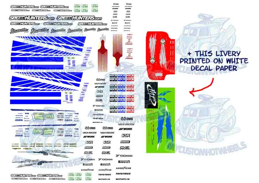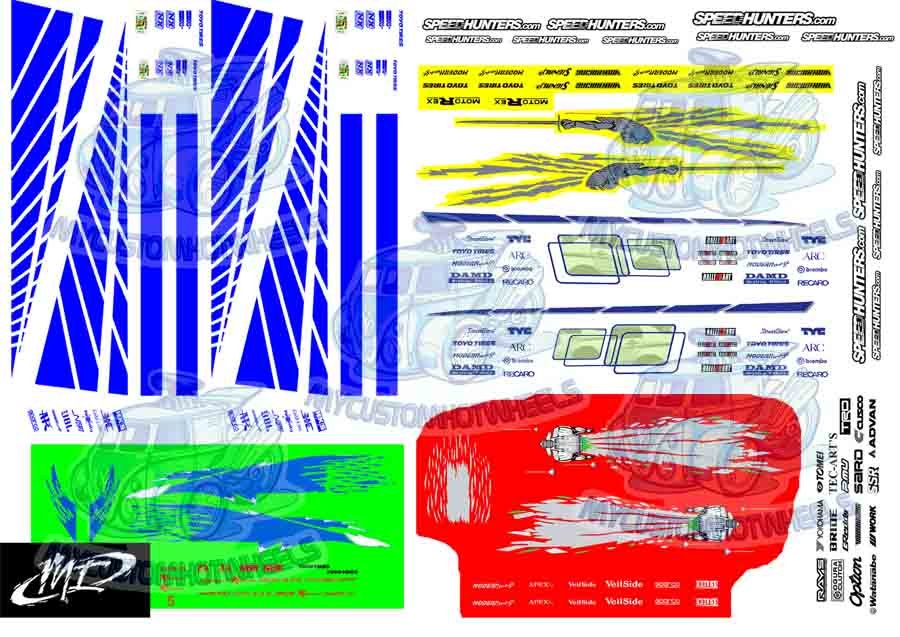 New decal pack design comes on clear with the Red RX7 livery and the Green Eclipse livery being printed on WHITE decal paper for your customising enjoyment.