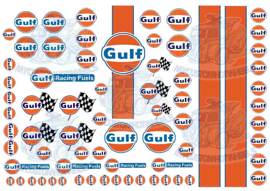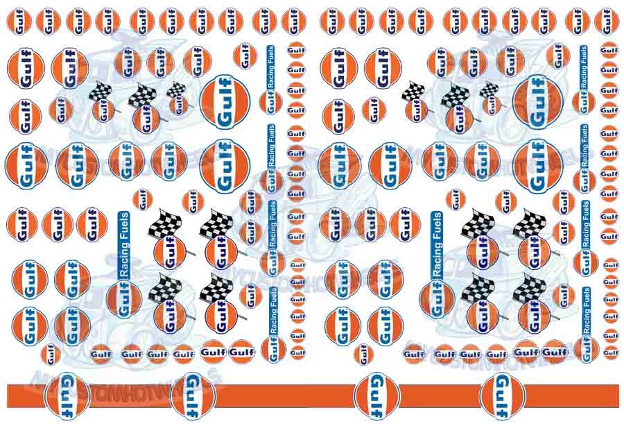 Take your custom Hot Wheels and Diecast Cars to a world of Gulf Racing with this must have set of waterslide decals – now available in all popular scales including 1:64, 1:43, 1:32, 1:24, and 1:18!