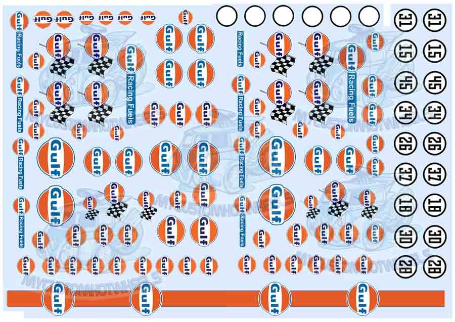 Gulf Racing Waterslide Decals are designed for and printed on both WHITE and CLEAR decal paper. Please specify which and see image for full decal description