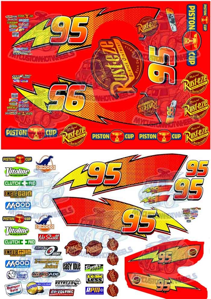 Create your own Lightning McQueen inspired custom with these Disney Cars and Lightning McQueen inspired Waterslide racing decals. Available in all popular scales up to 1:18 it was initially designed with the Hot Wheels customiser in mind – with the 1:64 scale version providing enough decals and 95′ Livery to create well over 10 Lightning’s and a whole team of Rust Eze sponsored racers.