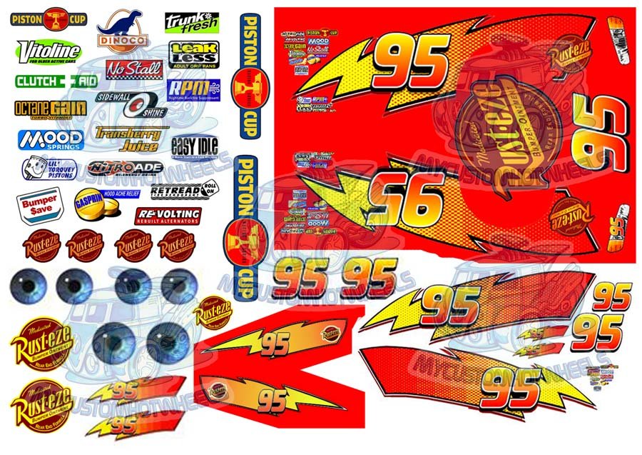 Create your own Lightning McQueen inspired custom with these Disney Cars and Lightning McQueen inspired Waterslide racing decals. Available in all popular scales up to 1:18 it was initially designed with the Hot Wheels customiser in mind – with the 1:64 scale version providing enough decals and 95′ Livery to create well over 10 Lightning’s and a whole team of Rust Eze sponsored racers. The majority of the images have been provided with red backgrounds as this waterslide decal sheet is best when served on a white backing and as such is not available in clear (unless specifically requested during ordering *add a note at checkout)