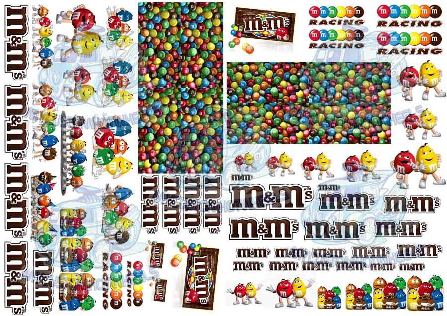 The M&Ms Racing Decal Sheet is printed and shipped on CLEAR Decal Paper – with a bonus section of white backed M&Ms so you can create a wrap on any section of your model car
