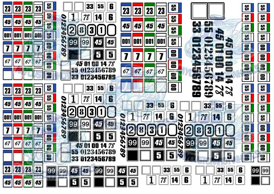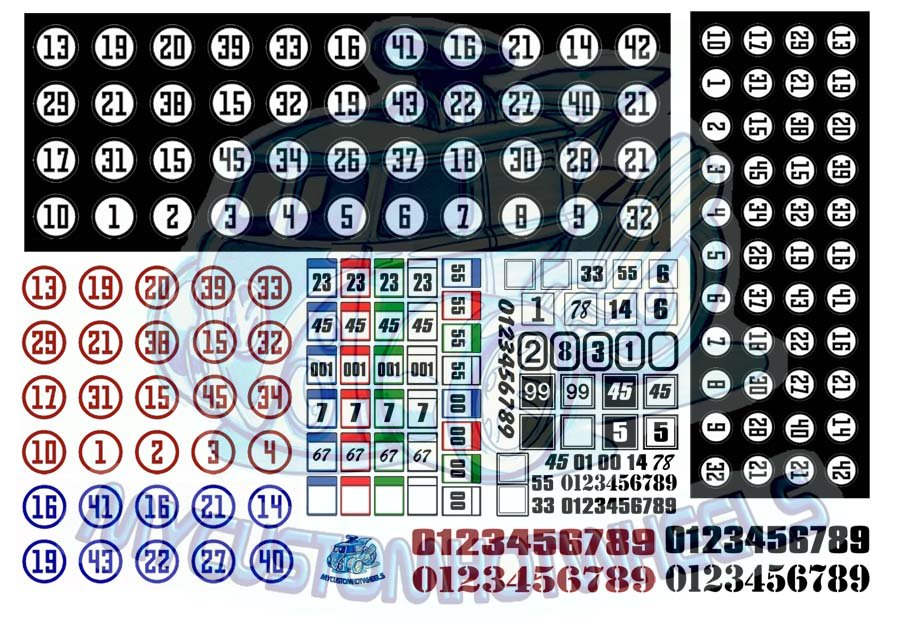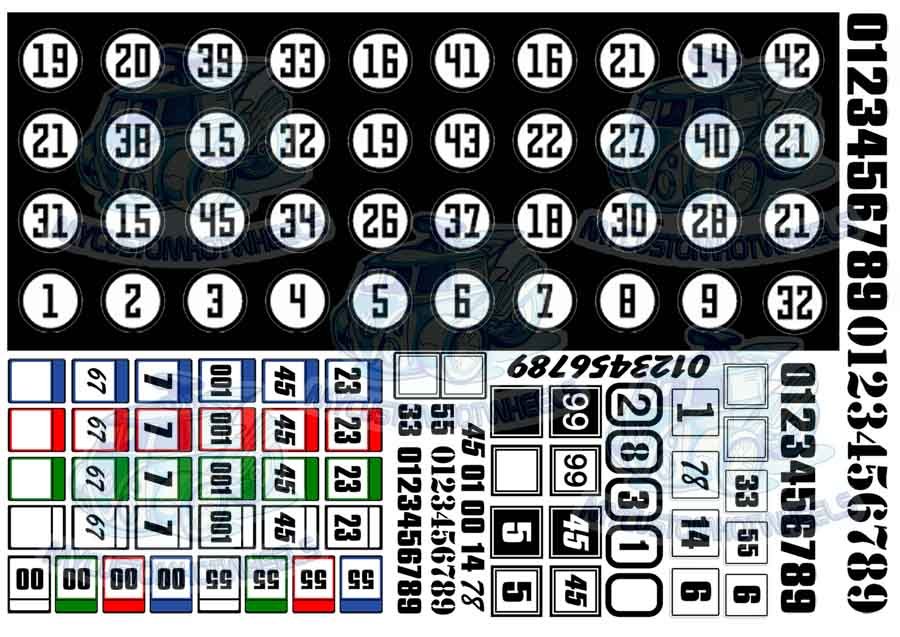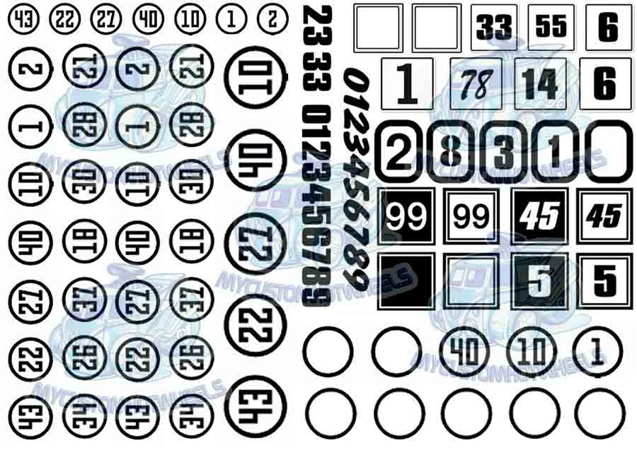 This Number decal pack comes with a variety of different sized numbers in circles as well as a selection of different number styles to be used as stand alone racing numbers.