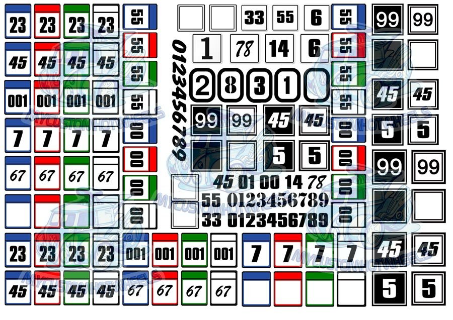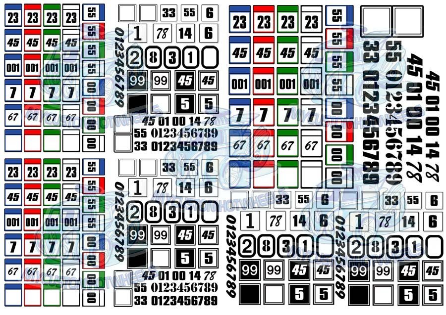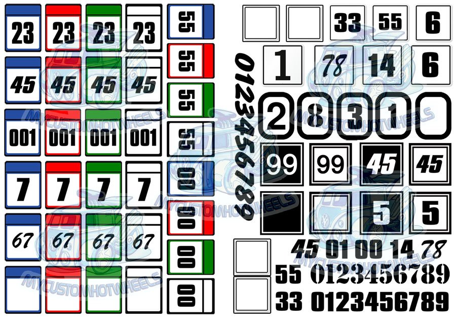 Racing Number Decals now available in squares with a range of numbers and racing livery. Included are all numbers 0 - 9 as well as a few blank squares so you can make your own square number decal in any combination you like. These quality waterslide racing decals are available in all popular model car scales from Hot Wheels 1/64 scale through to popular slot car and model kits up to 1:18