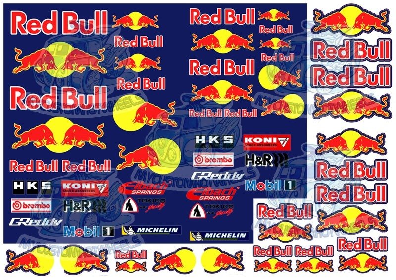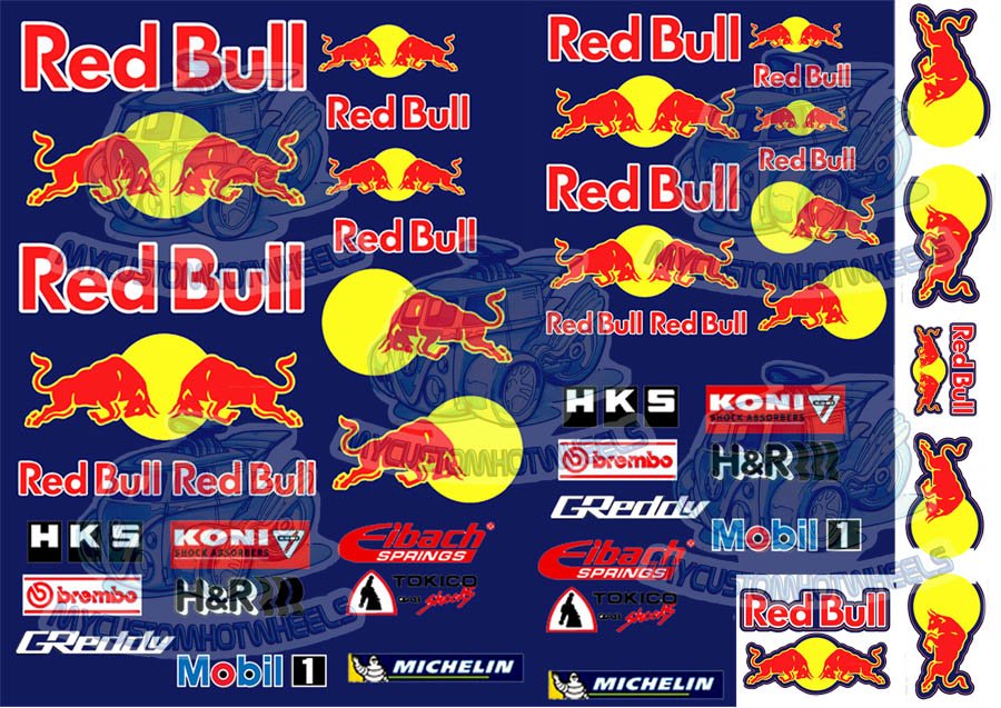 Now you can enjoy customising your next Hot Wheels creation with this winning formula – enjoying enough Red Bull themed racing livery to customize at least 20 cars in complete Red Bull Racing livery, or enough decals to add that Red Bull touch to over 50 of your 1:64 scale diecast cars… or slightly less to your next model car – in whatever popular scale you so happen to be building 🙂